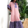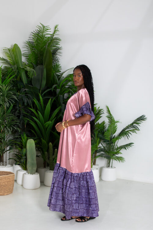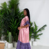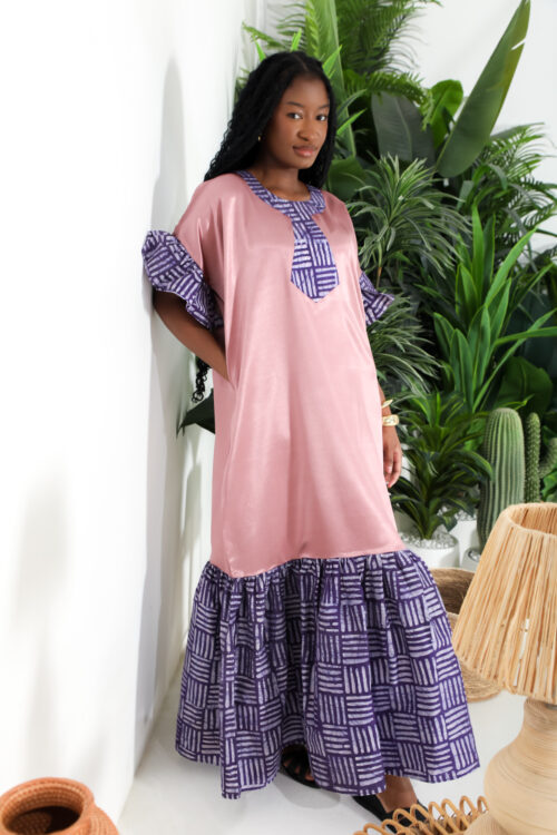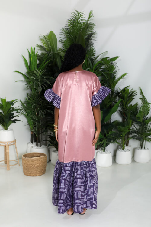 Shu Kaftan Dress, crafted from luxurious silky and irresistivly smooth to touch …sand color fabric . This relaxed and effortless elegance featurening African patternes, , it addes accent on the neckline, ruffled sleeve with tiered hem for a refreshing and modern boho look. Soft and flowy maxi length add movement and comfort, making it perfect for sunny days, resort getaways or laid back weekends, pair it with simple sandals and statement bangles for a chic ensemble